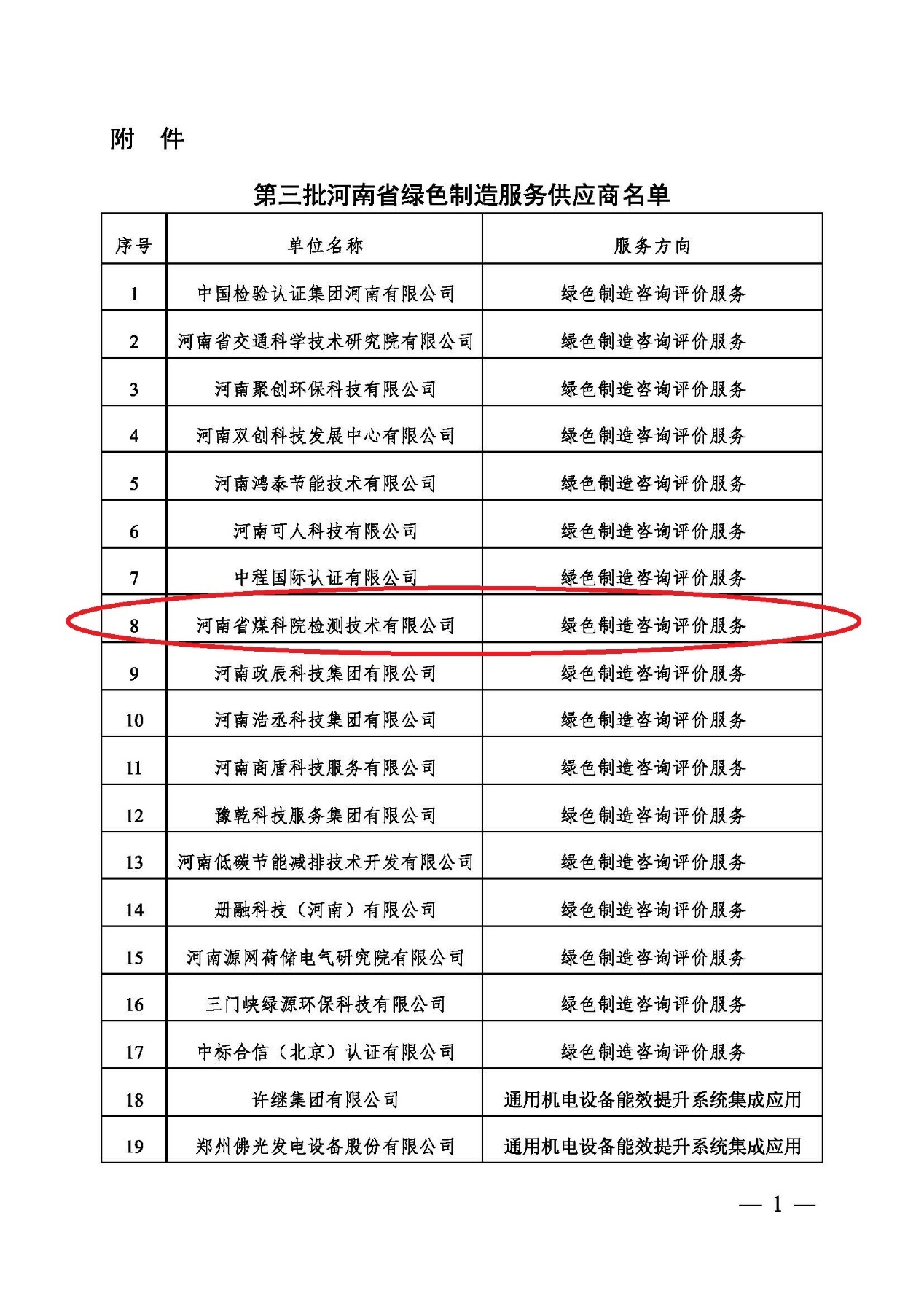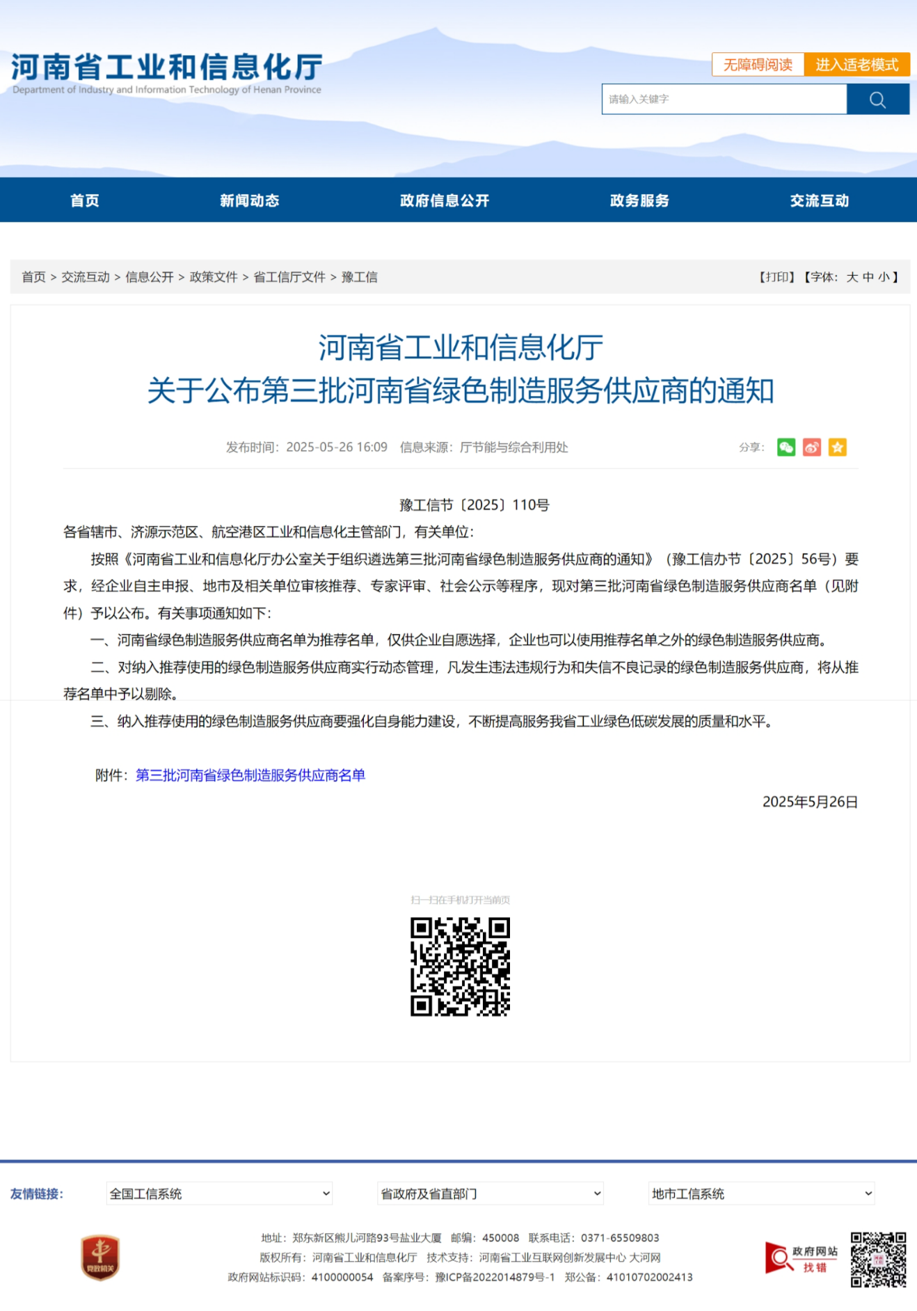 为贯彻落实《河南省制造业绿色低碳高质量发展三年行动计划(2023—2025年)》(豫政办〔2023〕6号),建全河南省绿色制造服务体系,针对河南省制造业绿色低碳转型需求,河南省工业和信息化厅于2025年3月组织开展了第三批河南省绿色制造服务供应商遴选工作。我公司长期从事工业节能与绿色制造服务相关工作,具有相应的专业技术能力和资质,并具有良好业绩。近日,河南省工信厅发布了《关于公布第三批河南省绿色制造服务供应商的通知》(豫工信节〔2025〕110号),我公司成功入选河南省绿色制造服务供应商名单。
