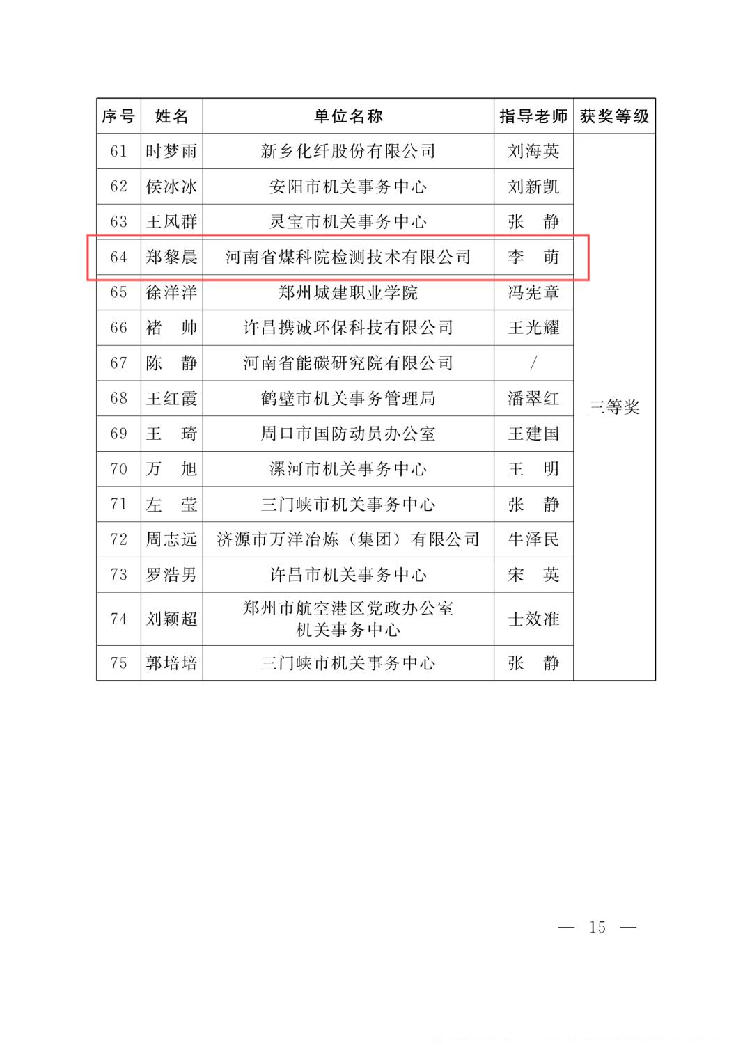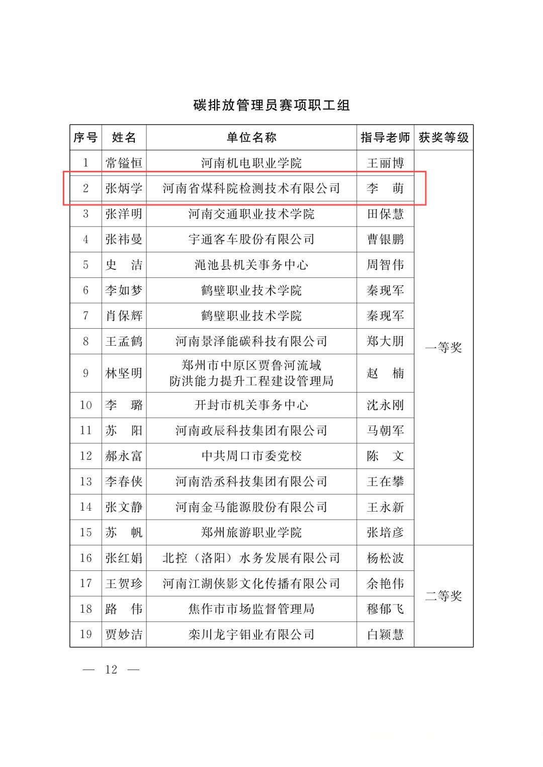2025年9月25日至27日,由河南省工业和信息化厅、人力资源和社会保障厅、总工会、机关事务管理局联合主办,河南省能效技术协会与河南机电职业学院承办的2025年河南省工业和信息化技术技能大赛在河南机电职业学院举办。近日,河南省工信厅发布了《关于公布2025年河南省工业和信息化技术技能大赛获奖名单的通知》(豫工信联节〔2025〕202号),我公司员工张炳学荣获大赛碳排放管理员赛项职工组第2名,获得一等奖,公司员工郑黎晨获得三等奖。
